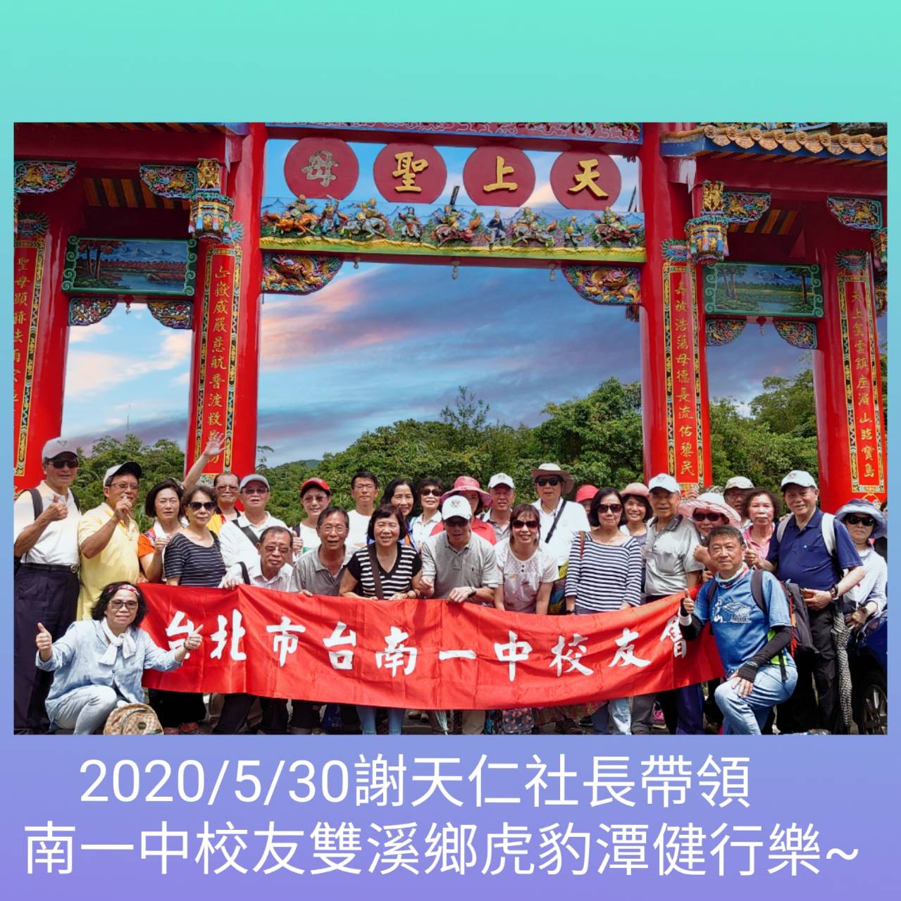 一、 活動地點:雙溪虎豹潭 二、 集合時地:8:30捷運國父紀念館4號出口。(整合配車) 三、 9:30抵達虎豹潭登山口(延著河岸往上直行,青山綠水全程在樹蔭下活動,走一圈約2個小時) 10:15親水河岸 11:00樓仔厝石塊屋喝傳統青草茶,魚腥草茶,看菜園 11:30過攔砂壩橋前往用餐 12:00農家野外風味餐(中藥燉野生鱸曼,在室外用餐,空氣流通自然風陣陣吹來) 四、 開車補助:已繳年費校友或榮譽校友-(請總幹事提供)-開車且有載繳年費校友者,每車補助400元。 全程費用:每人300元。 七、 報名專線: LINE:「台北市南一中登山社」群組,FAX:02-24699518 八、 登山社社 長:謝天仁(0932-044-956) 登山社總幹事:林順益(0932-029-232) 本 次 領 隊:陳順德(0911-718-626) 敬邀 備註: 1.有心臟病,心肌梗塞病史,高血壓,請勿參加,安全自負,以免給主辦單位造成困擾 2.請準備登山杖或雨傘,避免滑倒,請準備耐絞寧,以防萬一 3.身體有潛在問題者,要斟酌行程 4.請確實報名,事後取消者,仍需繳交報名費 5.今年4月以後有出國,與出國朋友接觸,發燒感冒等不舒服,或其他依規定需自主管理或隔離者,自行請假 6.活動搭車及必要時戴口罩,主辦單位會準備酒精消毒,相關活動本社將視疫情,適度調整 |