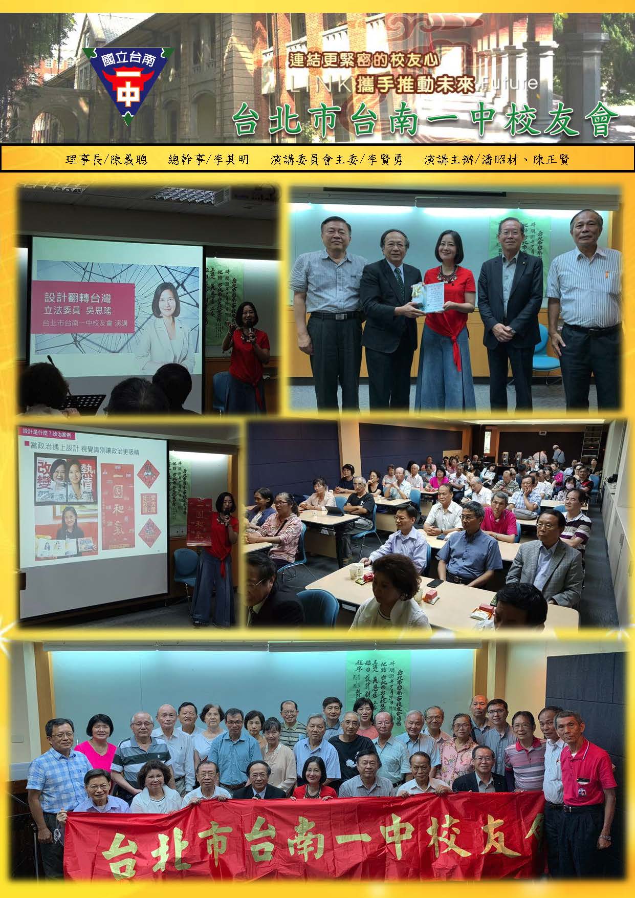 一、時間:2019年7月27日(週六) PM2:00-PM5:00 二、地點:台大校友會館 (台北市濟南路2-1號3樓B室) 三、演講人:吳思瑤立委 四、題目:設計翻轉台灣 五、主辦人:演講委員會 潘昭材委員、陳正賢委員、李賢勇主委 六、程序: 1. PM2:00-PM2:30 報到聯誼(有茶點) 2. PM2:30-PM3:00 吉他彈唱(林美均老師和蓋亞老師:鏗鏘玫瑰、夢醒時分、野百合也有春天、飄洋過海來看你、橄欖樹、城裡的月光) 3. PM3:00-PM4:30 演講 4. PM4:30-PM5:00 Q&A |