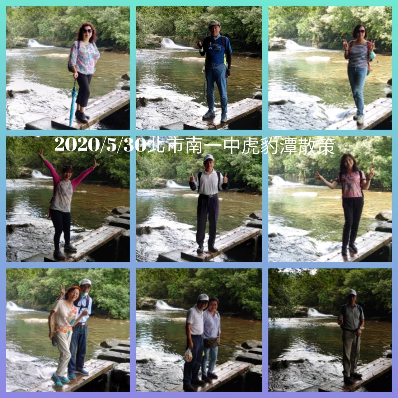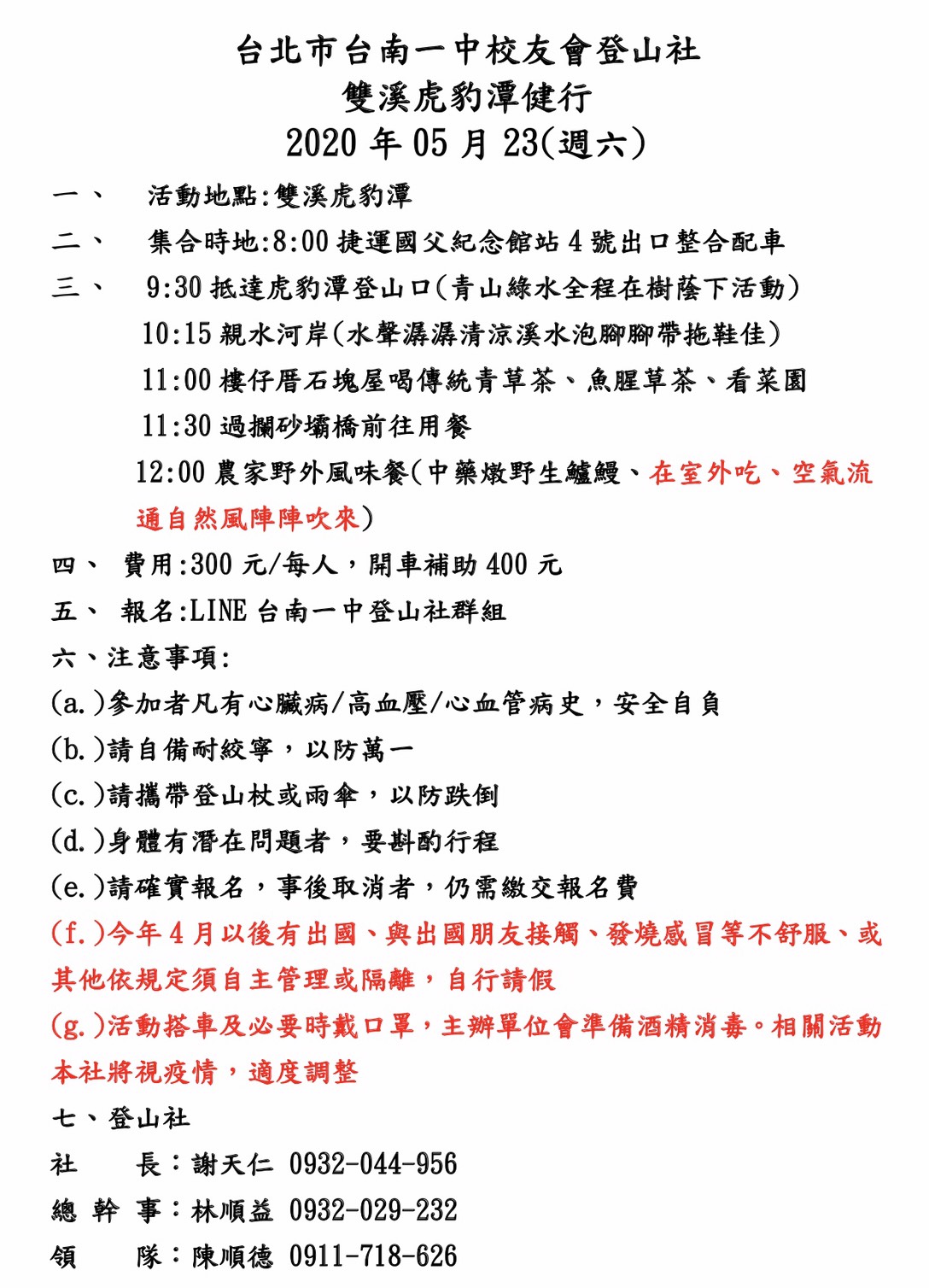 一、 活動地點:雙溪虎豹潭 二、 集合時地:8:30捷運國父紀念館4號出口。(整合配車) 三、 9:30抵達虎豹潭登山口(延著河岸往上直行,青山綠水全程在樹蔭下活動,走一圈約2個小時) 10:15親水河岸 11:00樓仔厝石塊屋喝傳統青草茶,魚腥草茶,看菜園 11:30過攔砂壩橋前往用餐 12:00農家野外風味餐(中藥燉野生鱸曼,在室外用餐,空氣流通自然風陣陣吹來) 四、 開車補助:已繳年費校友或榮譽校友-(請總幹事提供)-開車且有載繳年費校友者,每車補助400元。 全程費用:每人300元。 七、 報名專線: LINE:「台北市南一中登山社」群組,FAX:02-24699518 八、 登山社社 長:謝天仁(0932-044-956) 登山社總幹事:林順益(0932-029-232) 本 次 領 隊:陳順德(0911-718-626) 敬邀 備註: 1.有心臟病,心肌梗塞病史,高血壓,請勿參加,安全自負,以免給主辦單位造成困擾 2.請準備登山杖或雨傘,避免滑倒,請準備耐絞寧,以防萬一 3.身體有潛在問題者,要斟酌行程 4.請確實報名,事後取消者,仍需繳交報名費 5.今年4月以後有出國,與出國朋友接觸,發燒感冒等不舒服,或其他依規定需自主管理或隔離者,自行請假 6.活動搭車及必要時戴口罩,主辦單位會準備酒精消毒,相關活動本社將視疫情,適度調整 |
