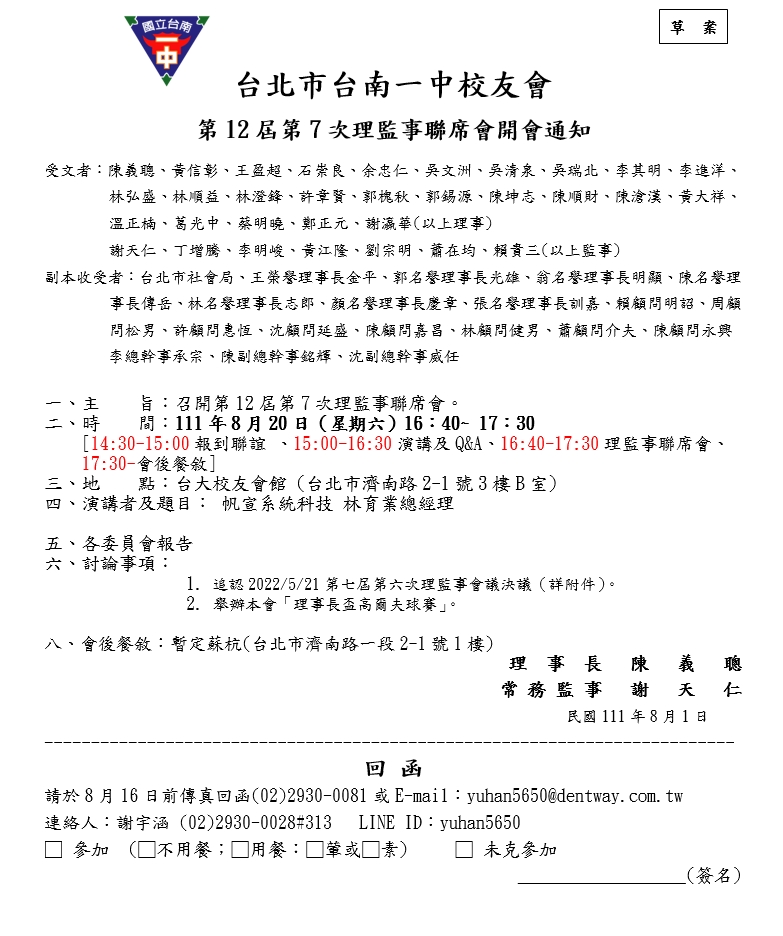 台北市台南一中校友會理監事會 時間:14:30-15:00、報到聯誼 時間:15:00-16:30、帆宣總經理 林育業學長 演講 時間:16:40-17:30、17:30預定蘇杭用餐 地點:台大校友會館3B |
