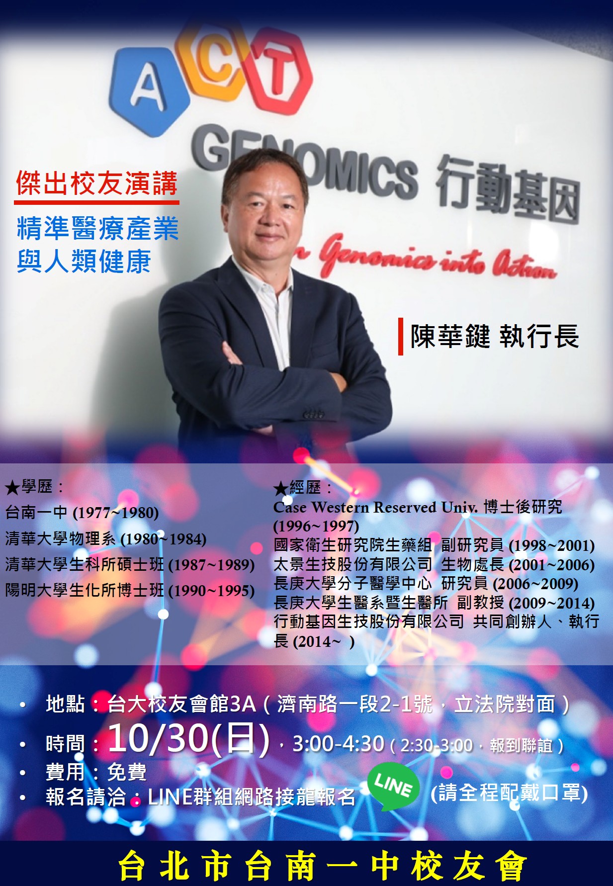 日期:10/30(日)14:30 地點:台大校友會館3B 主講:陳華鍵學長(陽明大學生化所博士、行動基因生技股份有限公司 執行長 ) 講題: 精準醫療產業與人類健康 主辦:演講委員會主委吳瑞北、委員吳文洲謝瀛華鄭正元蔡明曉黃江隆梁永芳顏永輝 14:30-15:00 報到聯誼 15:00-16:30演講及QA 16:40-17:30 理監事會 18:00 理監事會餐會 |