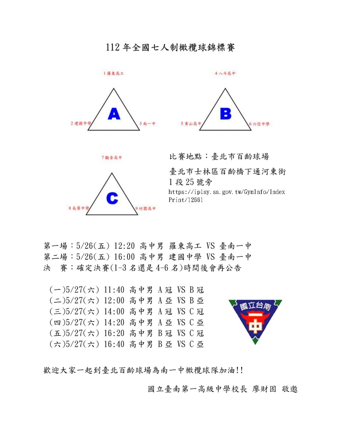 我們母校南一中橄欖球隊,參加今年全國七人制橄欖球錦標賽,已前進決賽, 5/26、5/27將於台北百齡球場爭奪錦標。 廖校長暨全體師生敬邀台北校友學長們前往球場幫南一中健兒加油! 5/26(五) 12:20起 羅東高工vs臺南ㄧ中 16:00起 建國中學vs台南ㄧ中 5/27(六) 11:40起(賽程依戰績而定) |