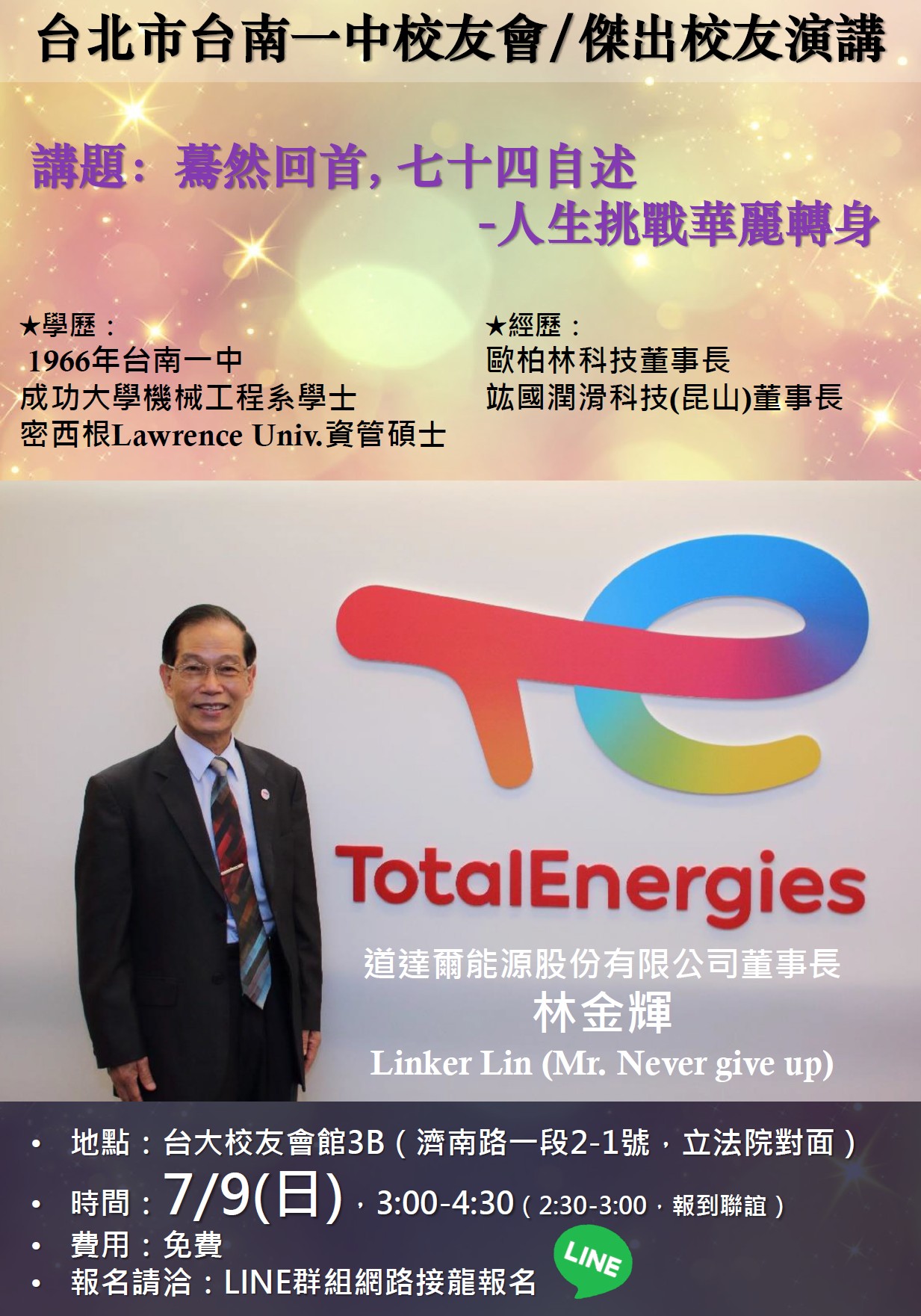一、日期: 7月9日(日) 14:30~15:00報到聯誼 15:00~16:30演講及QA 二、地點: 台大校友會館三樓3B會議室 三、演講者:林金輝董事長 四、演講題目:《驀然回首:七十四自述》人生的挑戰與華麗轉身 五、主辦: 演講委員會主委吳瑞北、委員吳文洲謝瀛華鄭正元蔡明曉黃江隆梁永芳顏 |