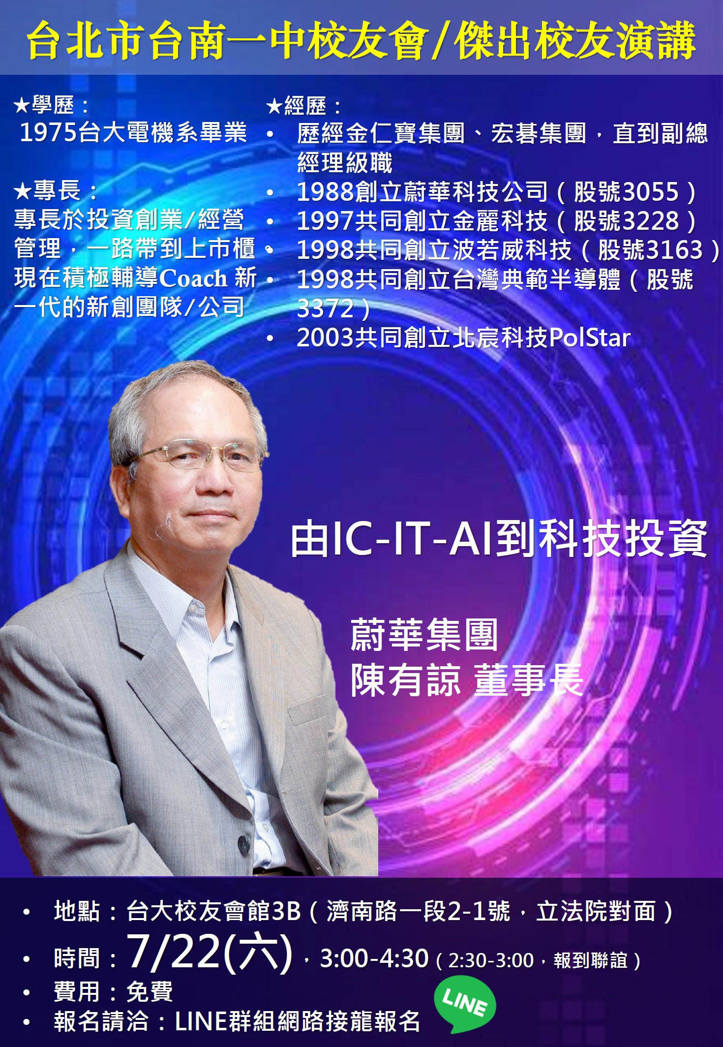 一、日期: 7月22日(六) 14:30~15:00報到聯誼 15:00~16:30演講及QA 二、地點: 台大校友會館三樓3B會議室 三、演講者:陳有諒董事長 四、演講題目: 由IC-IT-AI到科技投資 |
