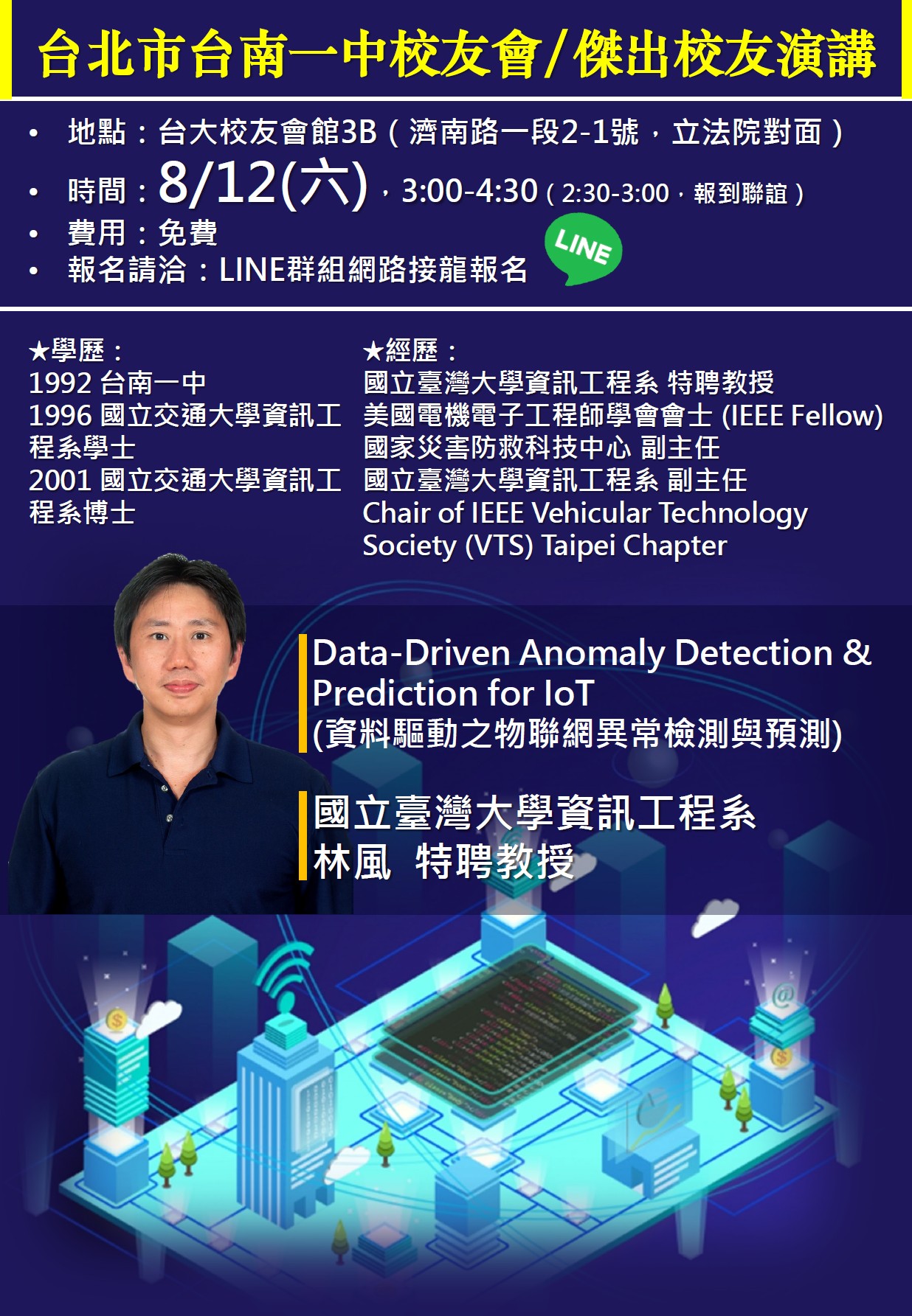 14:30-15:00報到聯誼 15:00-16:30演講及QA 地點:台大校友會館3B 主講:林 風學長(台灣大學資訊工程系教授) 講題: 資料驅動之物聯網異常檢測與預測。 主辦:演講委員會主委吳瑞北、委員吳文洲謝瀛華鄭正元蔡明曉黃江隆梁永芳顏永輝 |
