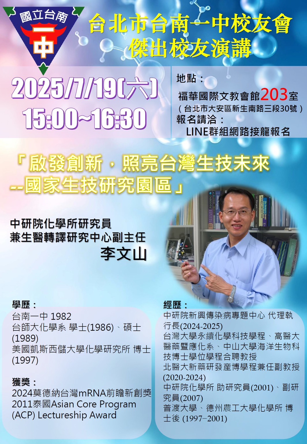 消息標題: 114年7月李文山學長演講活動公告 消息日期: 2025/7/19 地點: 福華國際文教會館101室 (台北市大安區新生南路三段30號) 15:00~16:30 內容:啟發創新,照亮台灣生技未來-國家生技研究園區 |
