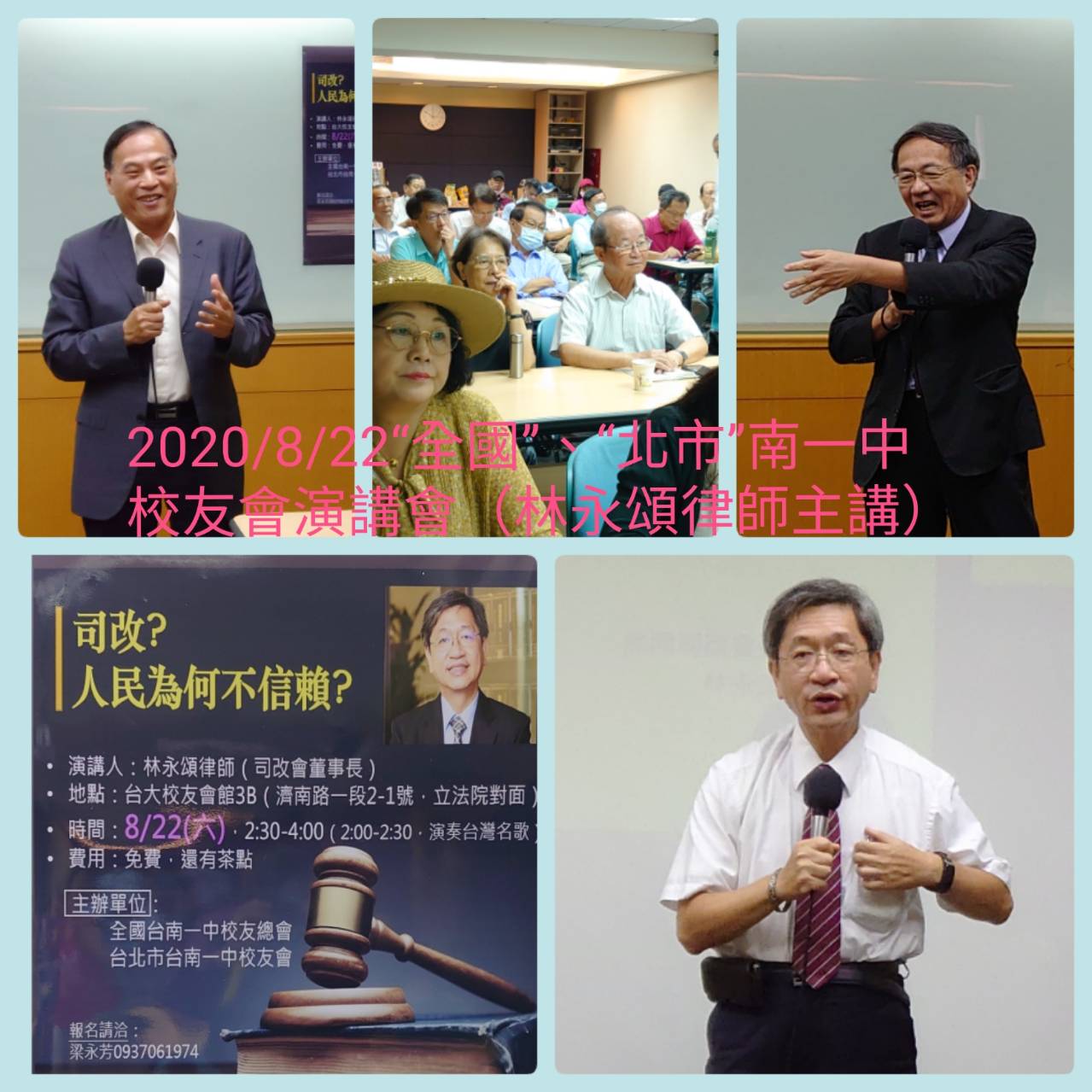 一、時間:2020年8月22日(週六)PM2:00-4:20 二、地點:台大校友會館3B(台北市濟南路2-1號3樓B室) 三、演講人:林永頌律師(司改會董事長) 四、題目: 司改?人民為何不信賴? 五、主辦人:演講委員會顏永輝、梁永芳委員、蔡智雄委員、陳正賢委員、黃宇白委員、潘昭材委員、沈威任委員、王冠傑委員、李賢勇主委。 六、程序: 1. PM2:00-2:30報到聯誼(備茶點、咖啡) 2. PM2:30-3:00音樂演奏 王清元老師(從事喜慶廟會表演40餘年,使用單簧樂器、薩克斯風。二位美麗的樂師 吳慧貞、王麗蓉為新北樂團的樂師) 表演歌曲: (1) 滿山春色 (2) 漂浪之女 (3) 懷春曲 (4) 素蘭小姐要出嫁 (5) 港都夜雨 (6) 流浪到台北 (7) 媽媽請您也保重 (8) 黃昏的故鄉 3. PM3:00-4:20 演講及Q&A 七、報名人數:限定70人,額滿為止。 八、演講人:林永頌律師簡介 【專長領域】 民商訴訟案件、刑事辯護、行政訴訟案件、工程案件、不動產案件、仲裁事件、企業法律、契約撰擬暨談判、社會改革、法律扶助與國會遊說 【學歷】 國立台灣大學法學碩士、國立台灣大學法學士 【經歷】 *現任:永信法律事務所主持律師 中華民國律師公會全國聯合會常務理事 財團法人民間司法改革基金會董事長、常務董事、執行委員 中華民國律師公會全國聯合會消費者債務清理委員會主任委員 台北律師公會消費者債務清理委員會主任委員 *曾任:財團法人法律扶助基金會台北分會會長 民間司法改革基金會執行長 工作傷害受害人協會義務法律顧問 台北律師公會監事 台北律師公會常務理事 中原大學財經法律系兼任講師 台北市選舉委員會監察小組委員 民進黨仲裁委員 |