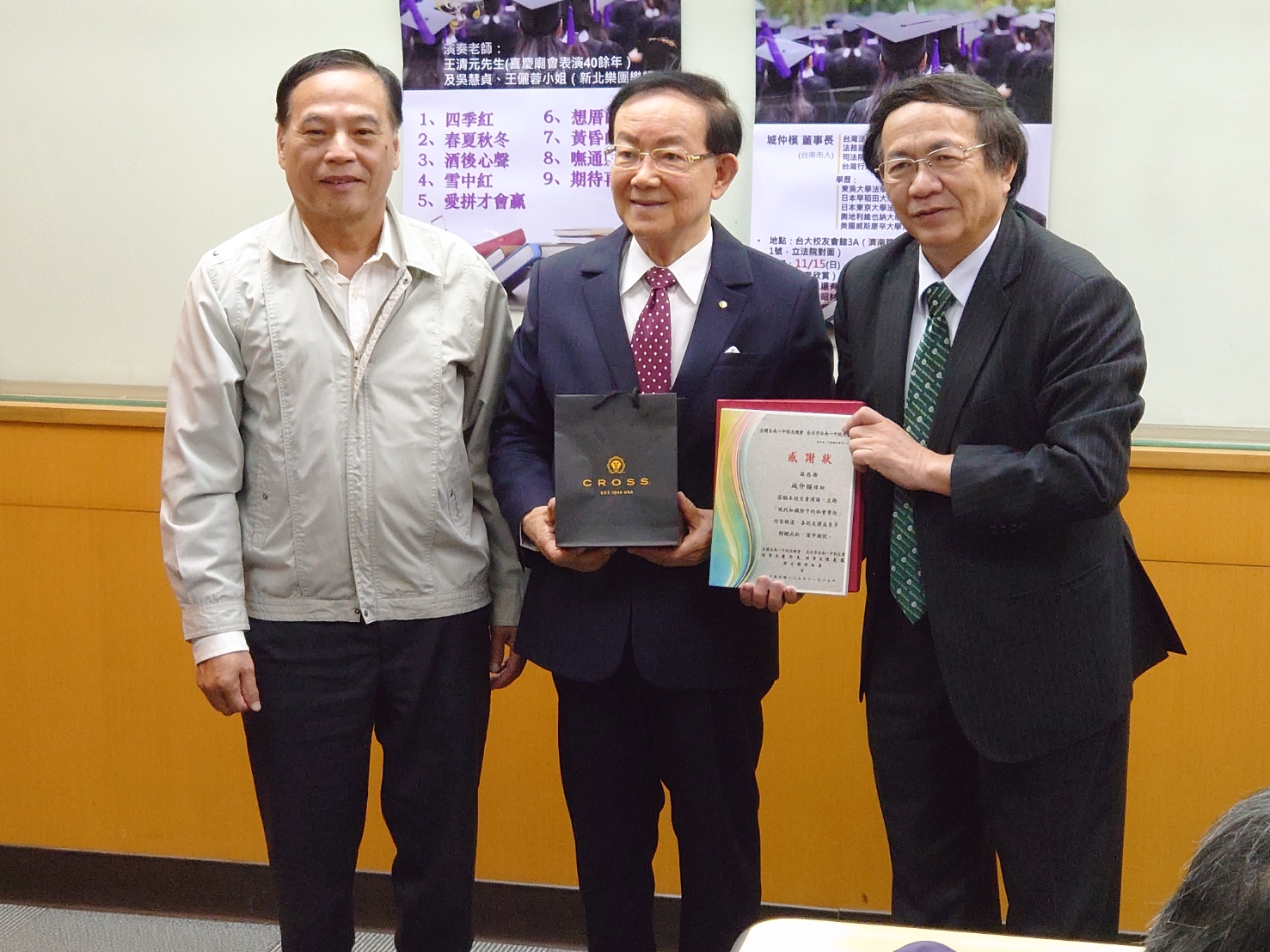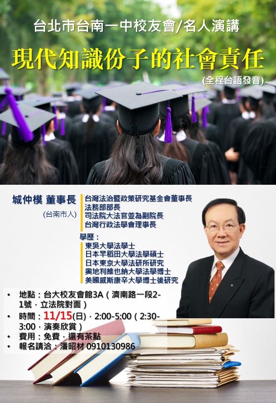 主講人:城仲模(前司法院副院長全場台語發音) 講 題:現代知識份子的社會責任 主辦單位:台北市台南一中校友會 主辦人:潘昭材0910130986 委員:李賢勇(主委)顏永輝 陳正賢梁永芳 沈威任 蔡智雄 時間:109年11月15日(星期日)下午2:00~4:20 地點:台北市濟南路2之1号3樓A室 2:00報到聯誼 2:10~2:40音樂演奏。 2:40演講開始 4:00 Q&A 4:20演講結束 4:30理監事會議 6:00理監事會議結束並餐敘 會前音樂表演 王清元老師(喜慶廟會表演40餘年)及吳慧貞、王儷蓉小姐(新北樂團樂師) 演奏歌曲: 1、四季紅 2、春夏秋冬 3、酒後心聲 4、雪中紅 5、愛拼才會贏 6、想厝的人 7、黃昏的故鄉 8、嘸通嫌台灣 9、期待再相會 |
