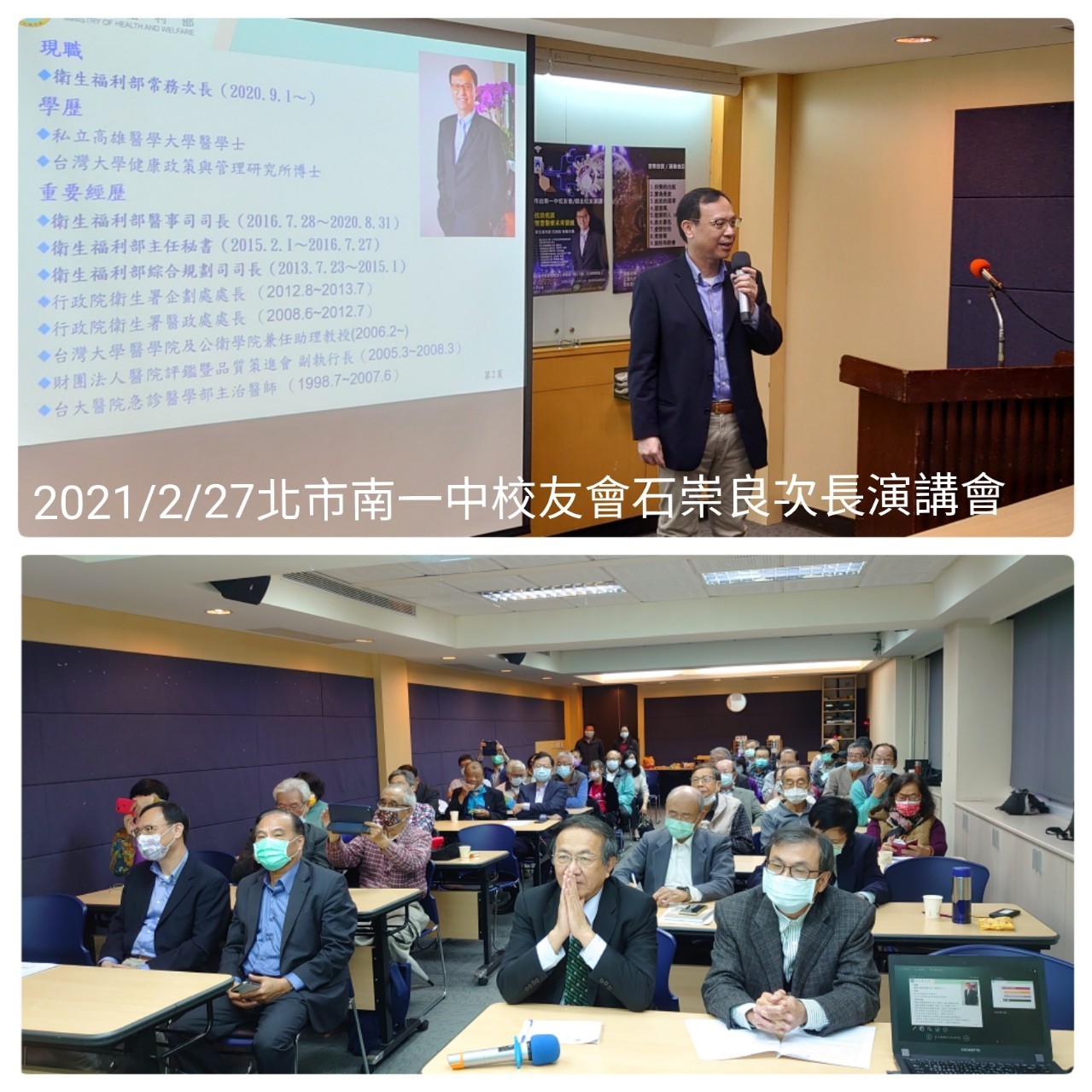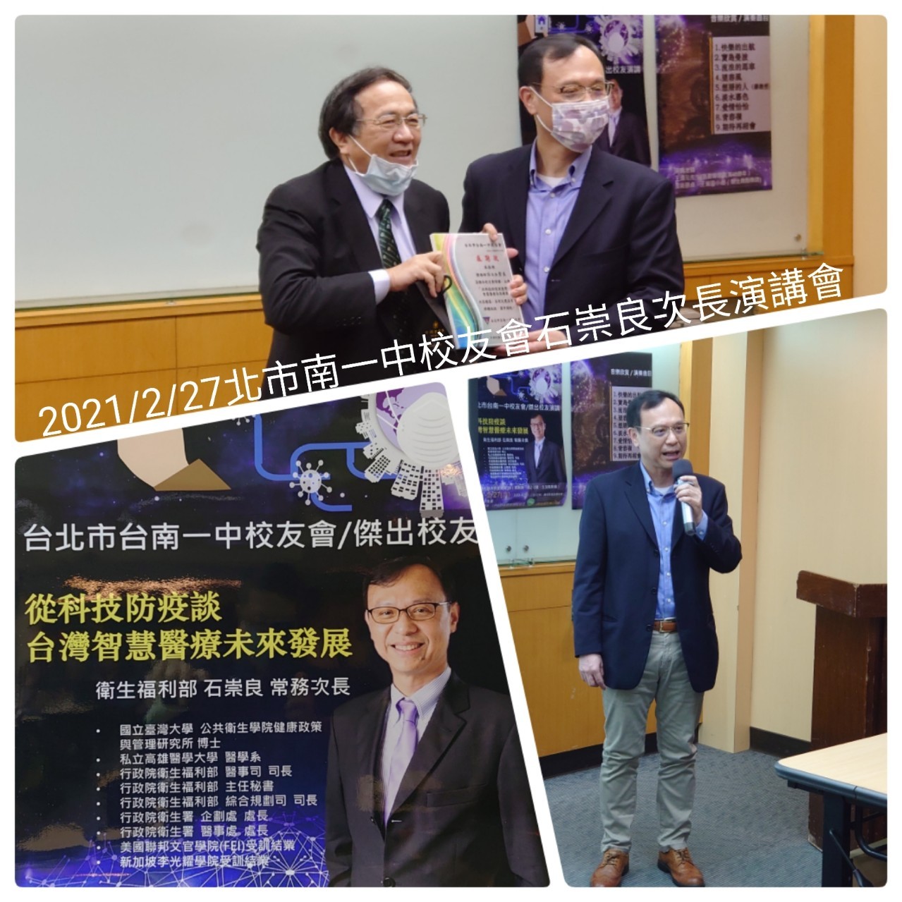 台北市台南一中校友會演講活動公告 日期:2/27(六) 14:00 地點:台大校友會館3B 主講:衛福部次長石崇良學長 講題:從科技防疫談台灣智慧醫療未來發展 主辦:吳常務理事瑞北主辦 14:00-14:20 報到聯誼 14:20-14:50薩克斯風演奏欣賞 15:00-16:30演講及QA 16:30-17:30理監事聯席會 17:30理監事聯席會會後餐敘 |