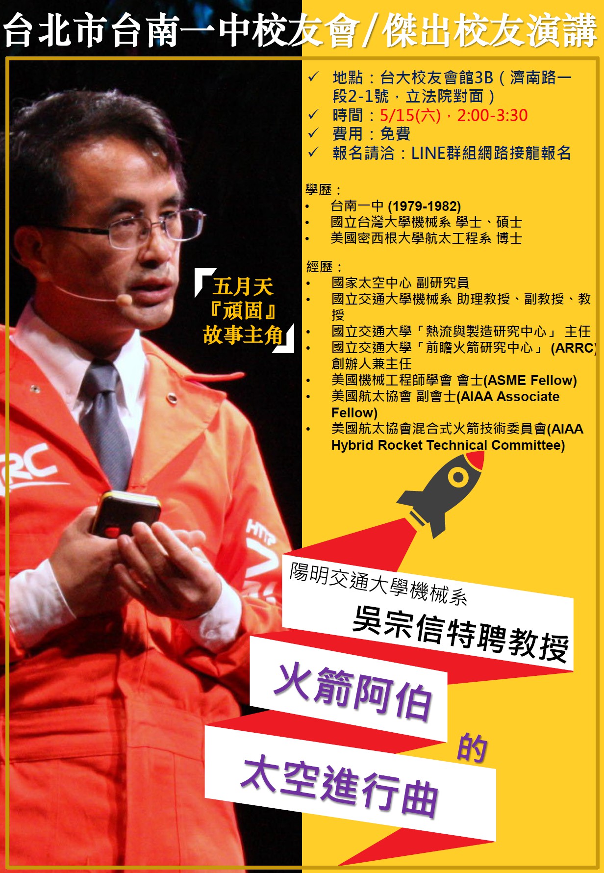 日期:5/15(六) 時間:13:30 地點:台大校友會館3B 主講:陽明交通大學機械系吳宗信特聘教授 講題:火箭阿伯的太空進行曲 主辦: 演講委員會主委吳瑞北、委員吳文洲,謝瀛華,鄭正元,蔡明曉,黃江隆,梁永芳,顏永輝 13:30-14:00報到聯誼 14:00-15:30演講及QA (15:40~理監事會) |