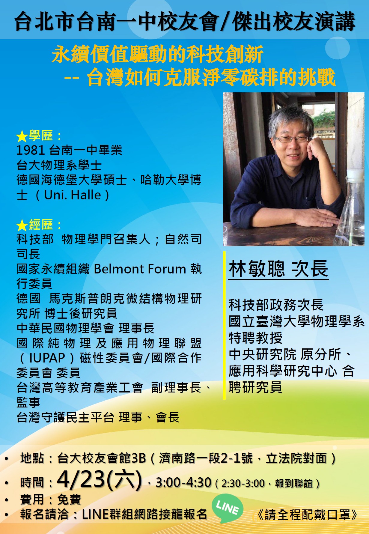 日期:4/23(六)14:30 地點:台大校友會館3B 主講:科技部政務次長 林敏聰學長 講題:永續價值驅動的科技創新 --- 台灣如何克服淨零碳排的挑戰 主辦:演講委員會主委吳瑞北、委員吳文洲謝瀛華鄭正元蔡明曉黃江隆梁永芳顏永輝 14:30-15:00 報到聯誼 15:00-16:30演講及QA 演講報名:《請全程配戴口罩》 |